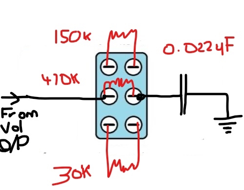 I want to have a one master volume, and since I never use my tone knob and leave it at 10, so I'd prefer to swap the tone knob out completely, but to give me some tonal options I think a DPDT switch could be handy with a couple different resistor values simulating a 500k pot at 10, 7 & 4... I can't seem to find any diagrams for this online.