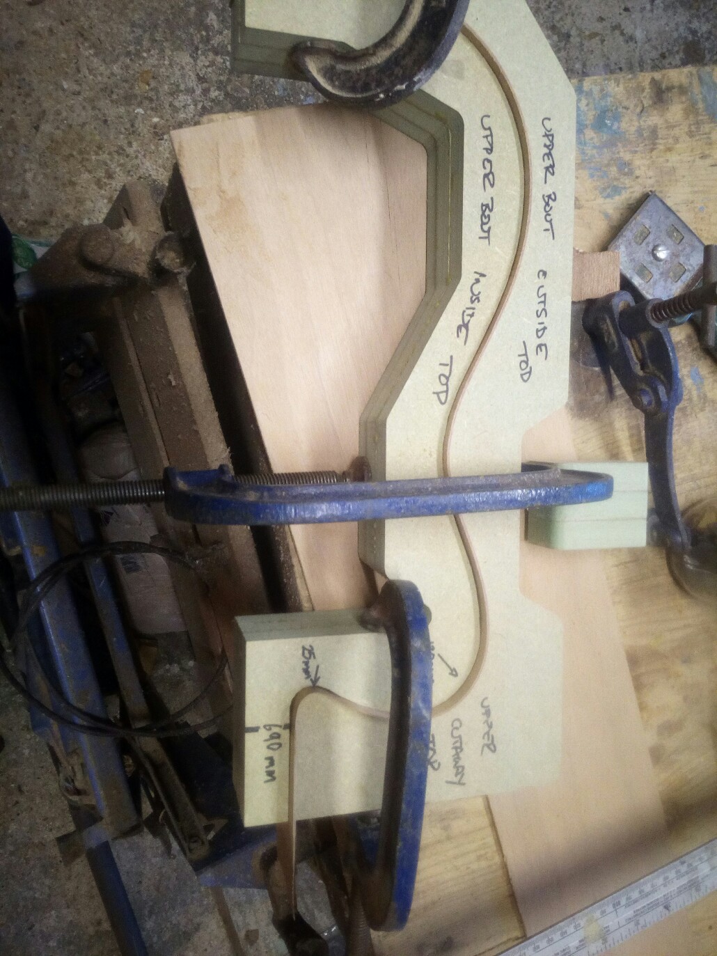 The top will be proper spruce, not plywood, I bought a piece. The back may well be ply, my piece has some interesting figuring. It will be a centre block semi, the whole bracing and other sophistication of a proper acoustic guitar is about five miles off from my comfort zone. If this one works out it will be a replacement body for my #2. If it ends up at something I consider acceptable and I enjoy doing it then it may be followed by a second Telecaster body based semi which might be a bass and a lot more radical, but because of my workshop situation that's liable to be a year plus away if it happens at all.