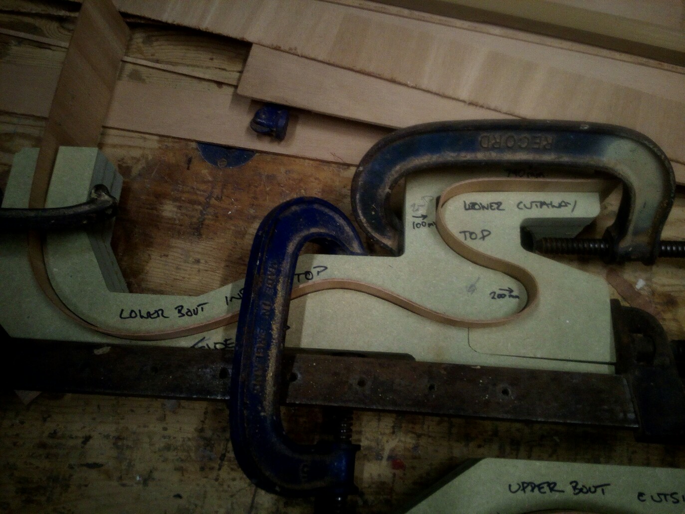 The wood was bent dry. I made an improvised bending iron by putting a piece of polished copper pipe in a vice and pointing a hot air paint stripper at it! I thought I'd have to thin down the sharp bend where the top bout meets the neck, and I did in the proof of concept piece, but in the end I got away with it. The Tele shape is mostly pretty even curves, well within the capabilities of my plywood, its only the cutaway and the top bout by the neck that need treatment. I cut potential ribs that were way overlength and started at the neck end, so when it went wrong and broke I just sliced off the end and moved down a bit. I had 3 or 4 breaks in all, including the concept proof. Any proper skilled luthier reading this will be falling about laughing!