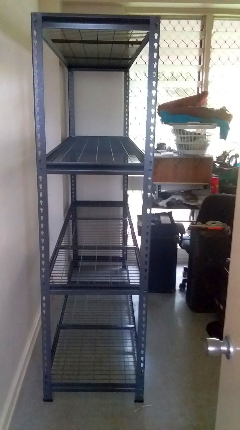 Last week, I bought a couple of new shelving systems from my local Bunnings store, these new shelving systems I bought are 1.9m X 1.9m X .540m in size, are finished in powder coated grey, and are supposed to be able to withstand up to 400kgs in weight, I'm using them as extra storage space so I can re-organize my home studio room, I've just been spending some time putting one of the shelving systems together, and there's only one more to assemble, they are very easy to put together......even for a newbie like me....okay, I did have to do some hammer 101 revision but I digress....hahahaha...., the only tools needed are a rubber mallet, or claw hammer, and a block of wood.