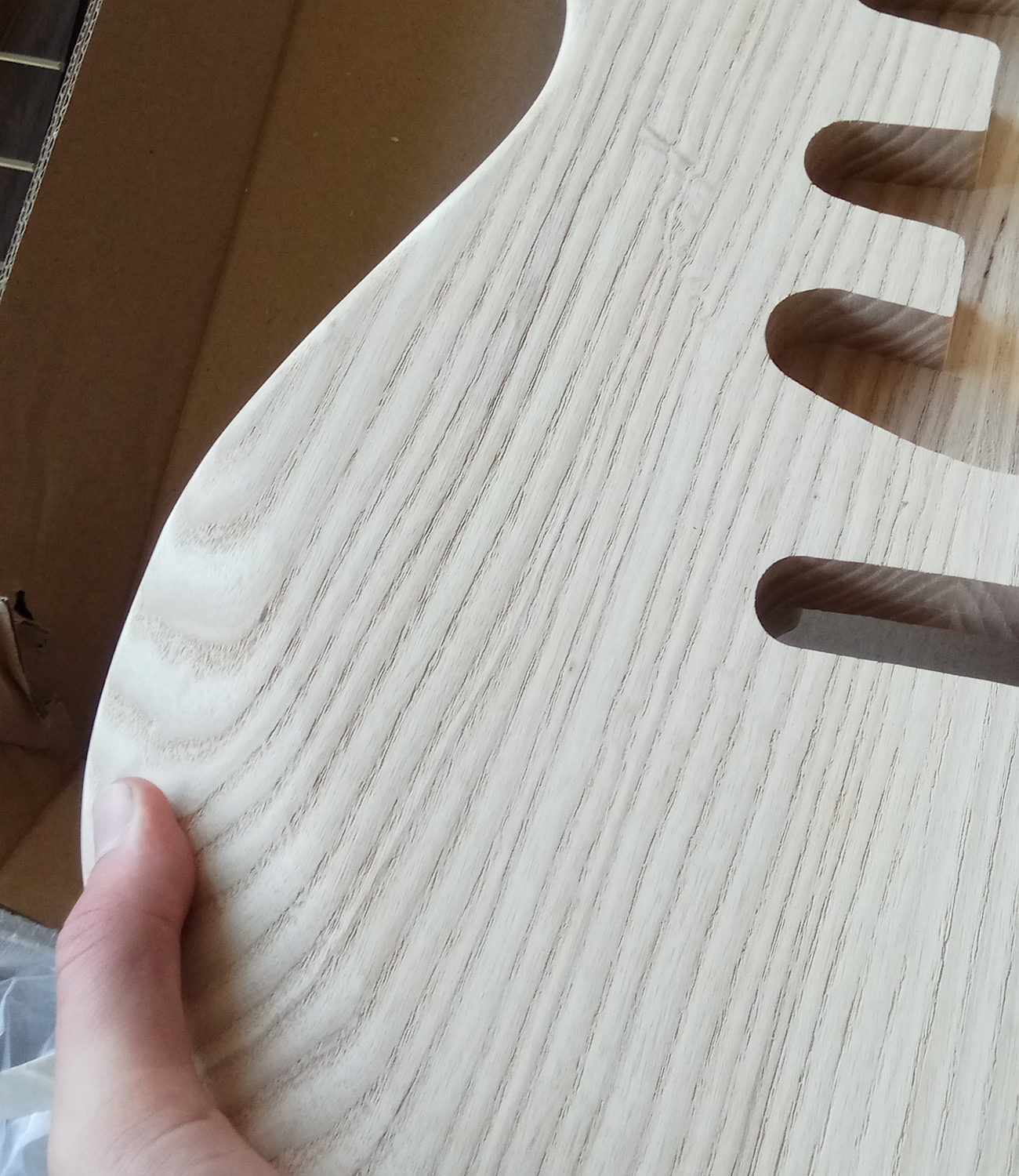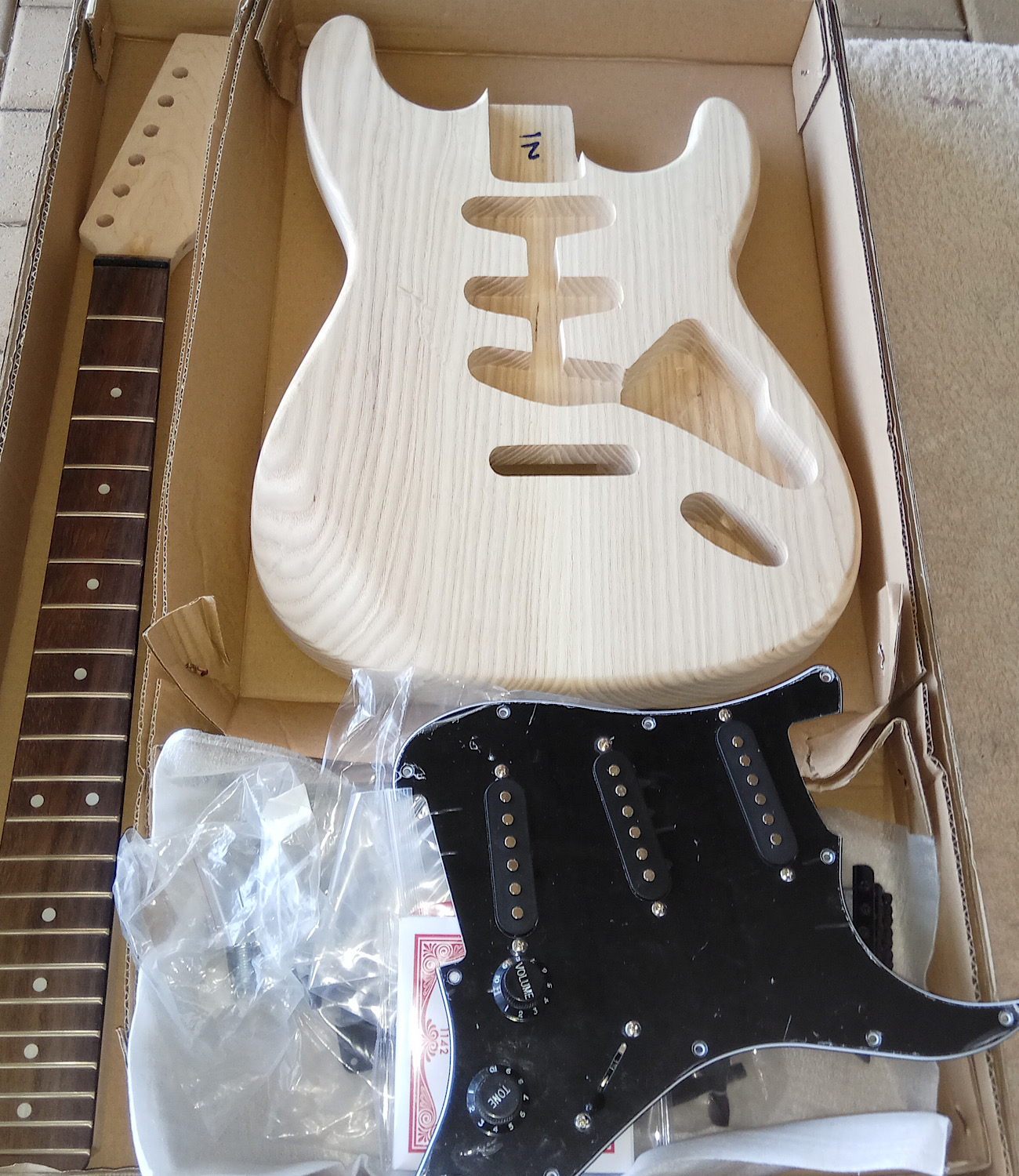 This week my next (3rd) kit arrived, a beautiful gst kit. Nice ash body with a really nice Jatoba fretboard.