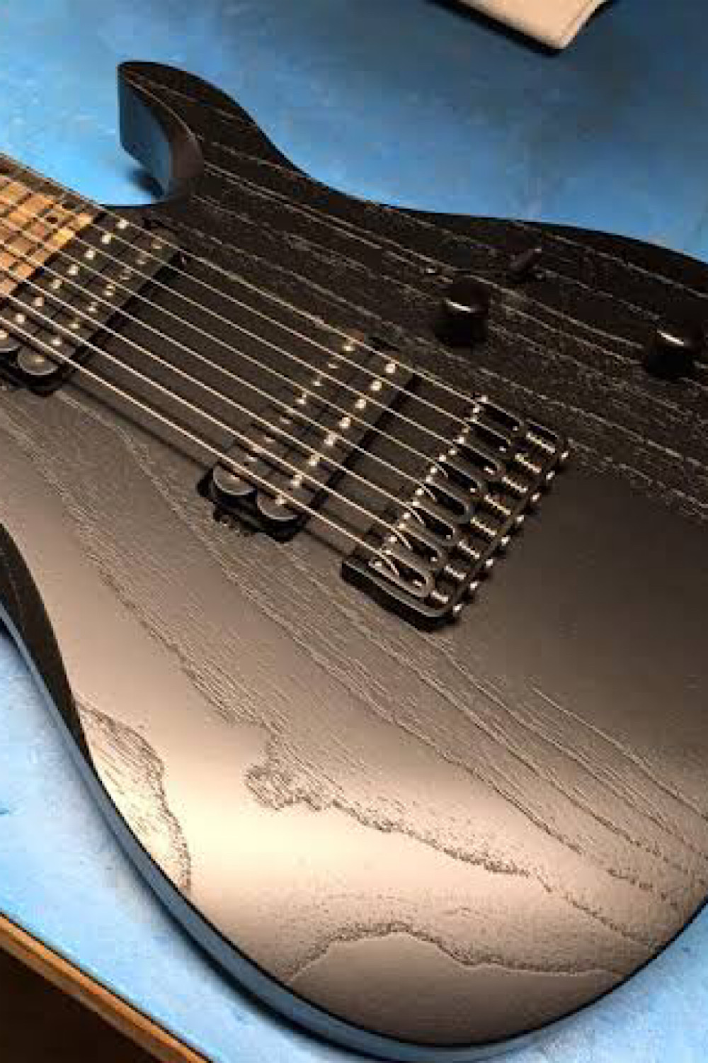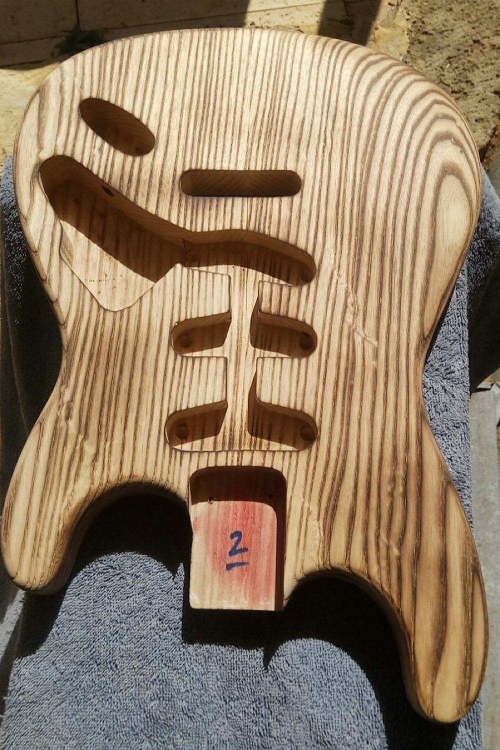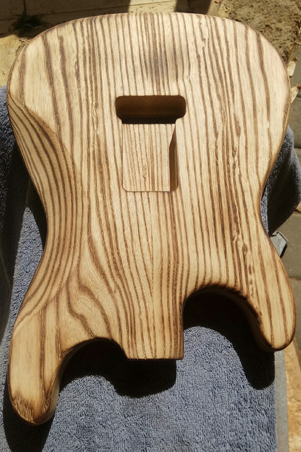 Then came the fun part- Fire! Using a blowtorch attached to the bbq gas bottle, I burnt the surface of the wood, darkening the grain and turning the wood a slightly darker colour. This Japanese technique is called Shou Sugi Ban and was actually originally used for waterproofing wood (once burnt and sanded it is sealed with a particular oil). I’ve seen it done a few times on guitars, Crimson guitars over in the UK have done it once or twice on youtube. Anyway this came out extremely well and after some wire brushing, became really textured and 3d. The extra curve on the forearm contour really shows off the burning and brushing.