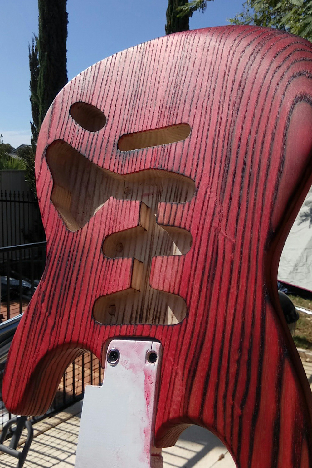 I had a successful morning adding colour to the guitar. I used Karijini red dingotone and man this stuff is nice to use. Definitely going to be using it again in the future.