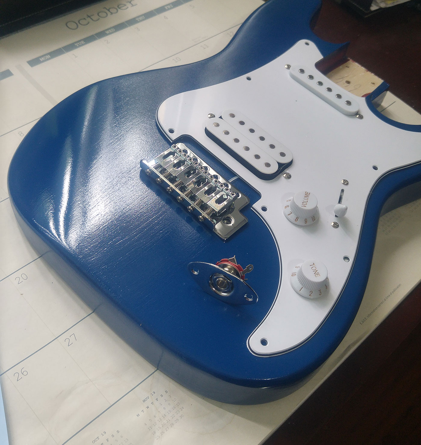 I thought about mounting it on the pickguard just behind the tone knob but it would be a very tight squeeze. So I think a hole on the side corner, opposite the final pick guard screw may be the best place.