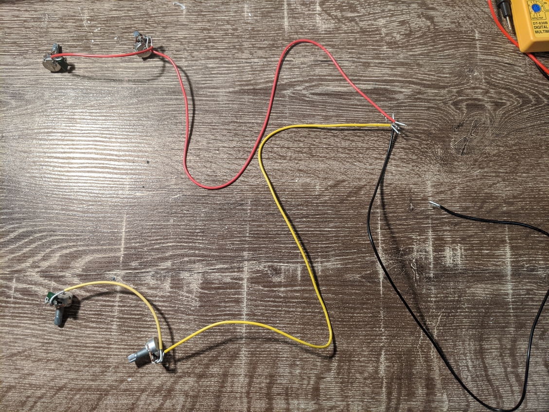 Each tone pot is soldered to a volume pot (yellow + red), then the wires from each volume pot are soldered together with an additional black wire, I'm pretty sure this black wire is to be connected to the output jack.