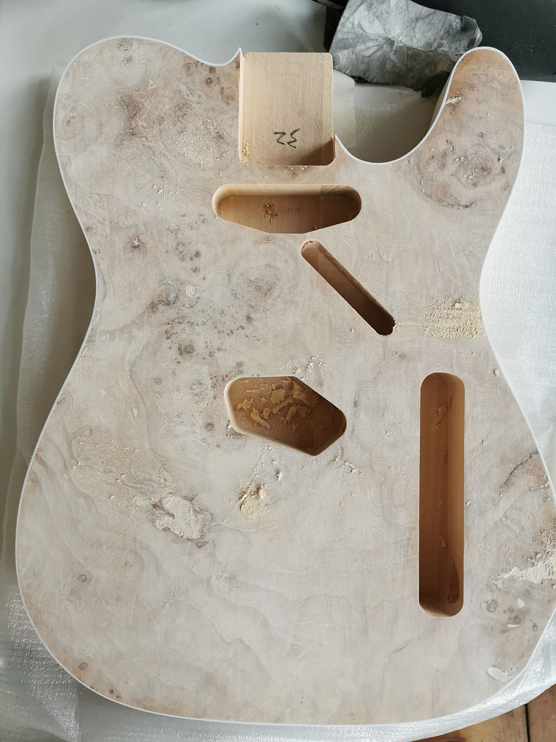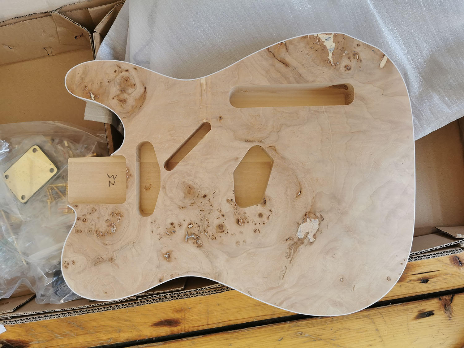 So I picked a burl top telecaster kit from "Muslady". I must admit that I never really lusted for a telecaster, but as I wanted to start quickly, the choice of readily available kits in my country is scarce. I eyed the Les Paul kits quite badly, but in these crazy times I just felt I can't drop 300€ on a pretty Les Paul kit with no building experience.