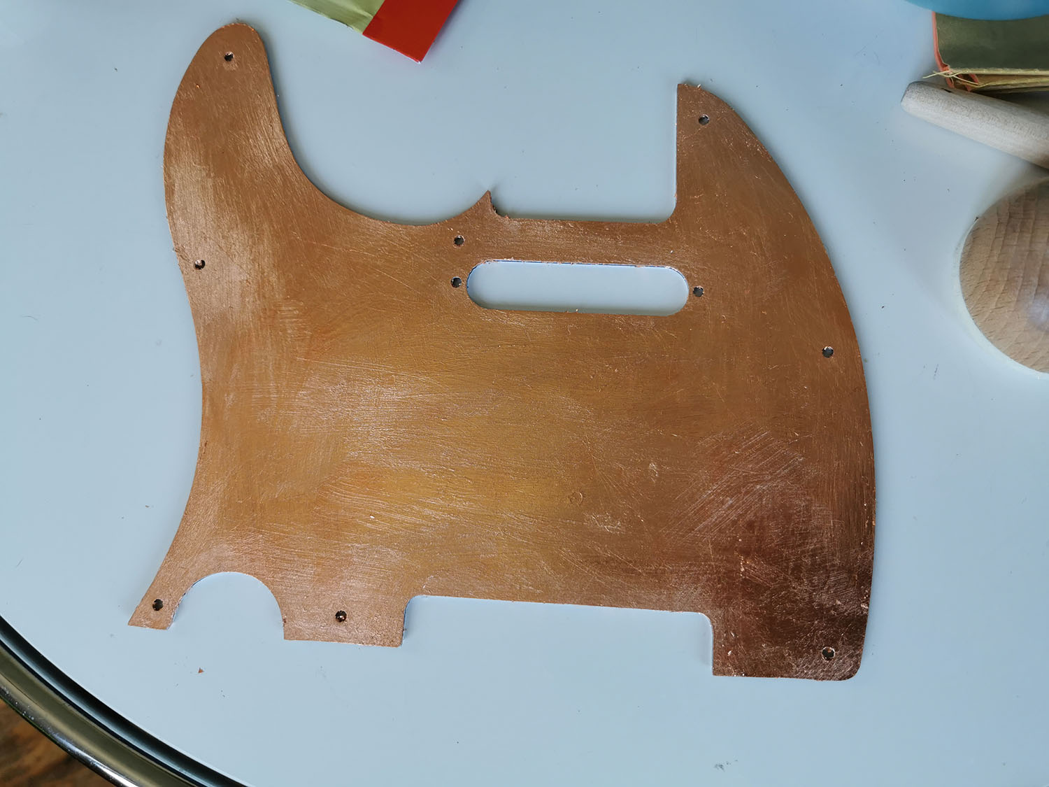 The guitar comes with a white pickguard which I hope to be able to copper leaf and then age with vinegar and salt.