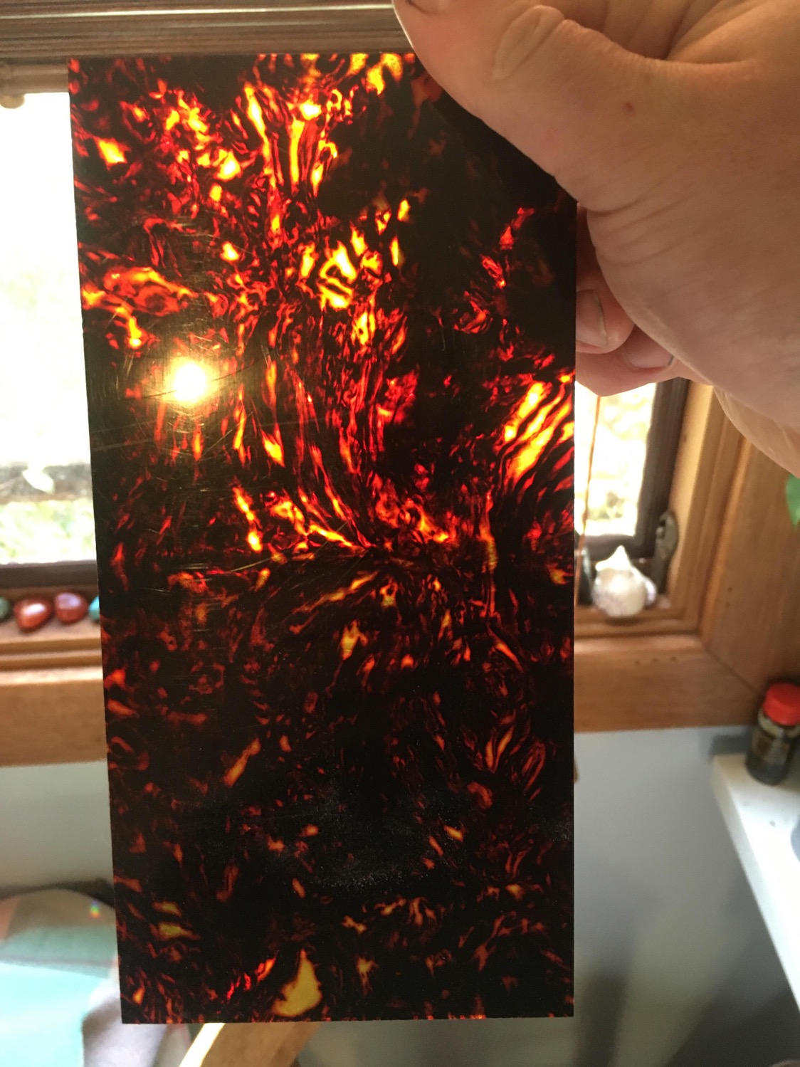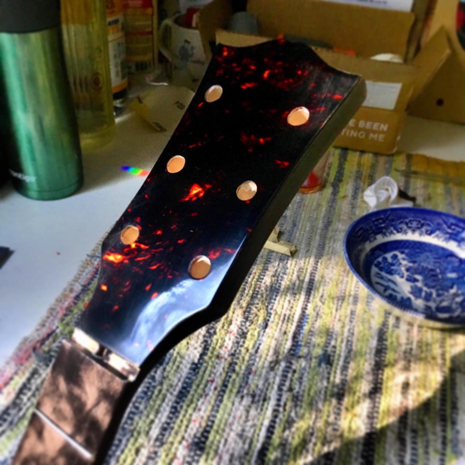 Going to make a headstock veneer out of some brown tortoieshell celluloid, maybe a pickguard too.