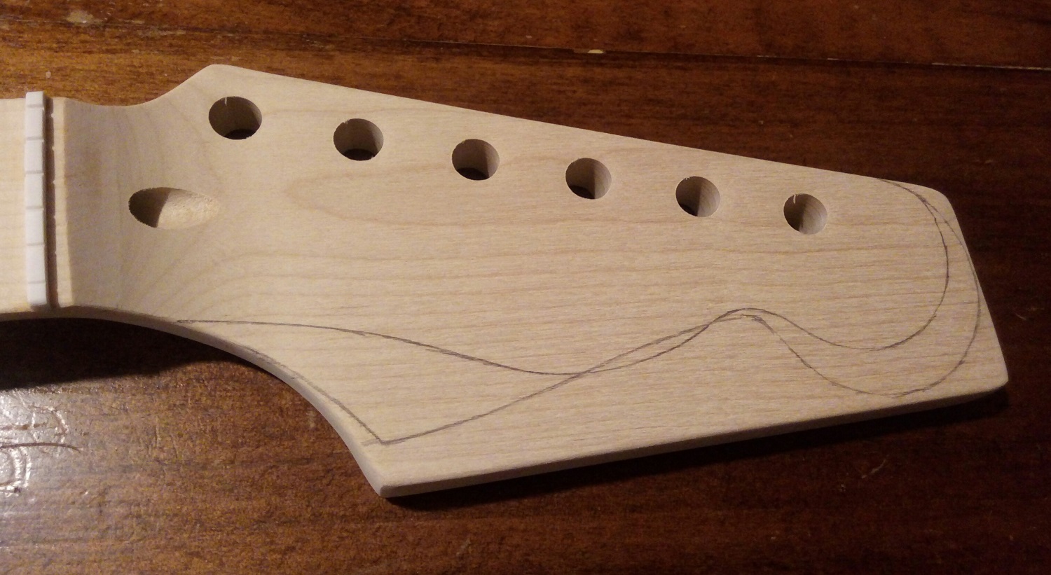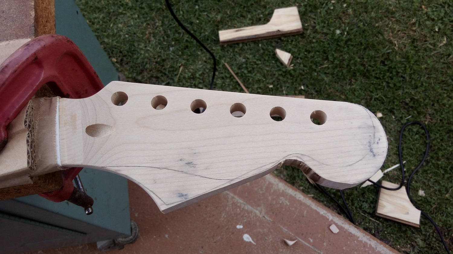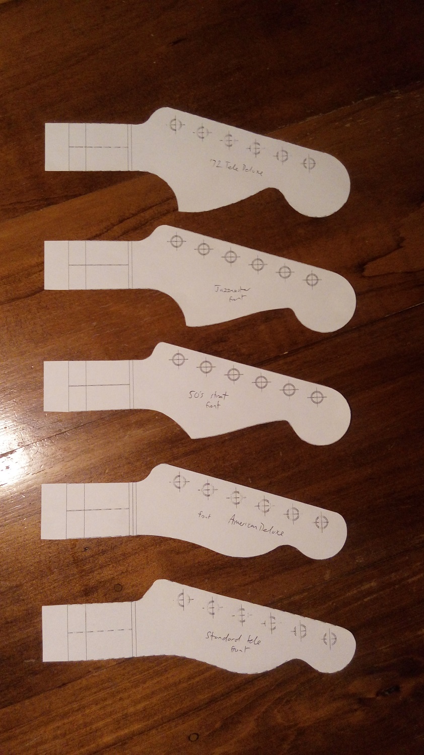 Next headstock. I wanted the fatty 72 Deluxe style but the blank just doesn't have quite enough meat. I marked out both a standard looking Strat style and the Tele Deluxe. Then went at it with my jigsaw. This looks gruesome, but it's not hard to clean up. Oh, the templates were from that "Fenderheadstocks.pdf" I've seen referenced several times. I can send it to you if you like.