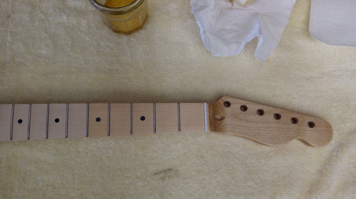 I think I'll just do the fretboard in the same way, just not so many coats. The neck itself I have applied 3 coats now. And lastly I wet sanded it gently with 1200 grit in a mix of turps and BLO. It feels NICE but I'll show you that once I attach it to the body
