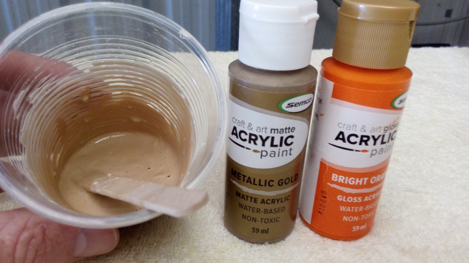I didn't want a dark grain, but I wanted something that would stand out a little. So when I mixed my Timber Mate with a little warm water I added some gold sparkly acrylic, and then for whatever reason (I thought it looked a bit pale and boring) I added about 3 drops of orange. It still looked pretty ordinary, but I figured there was only one way to find out how it would behave.