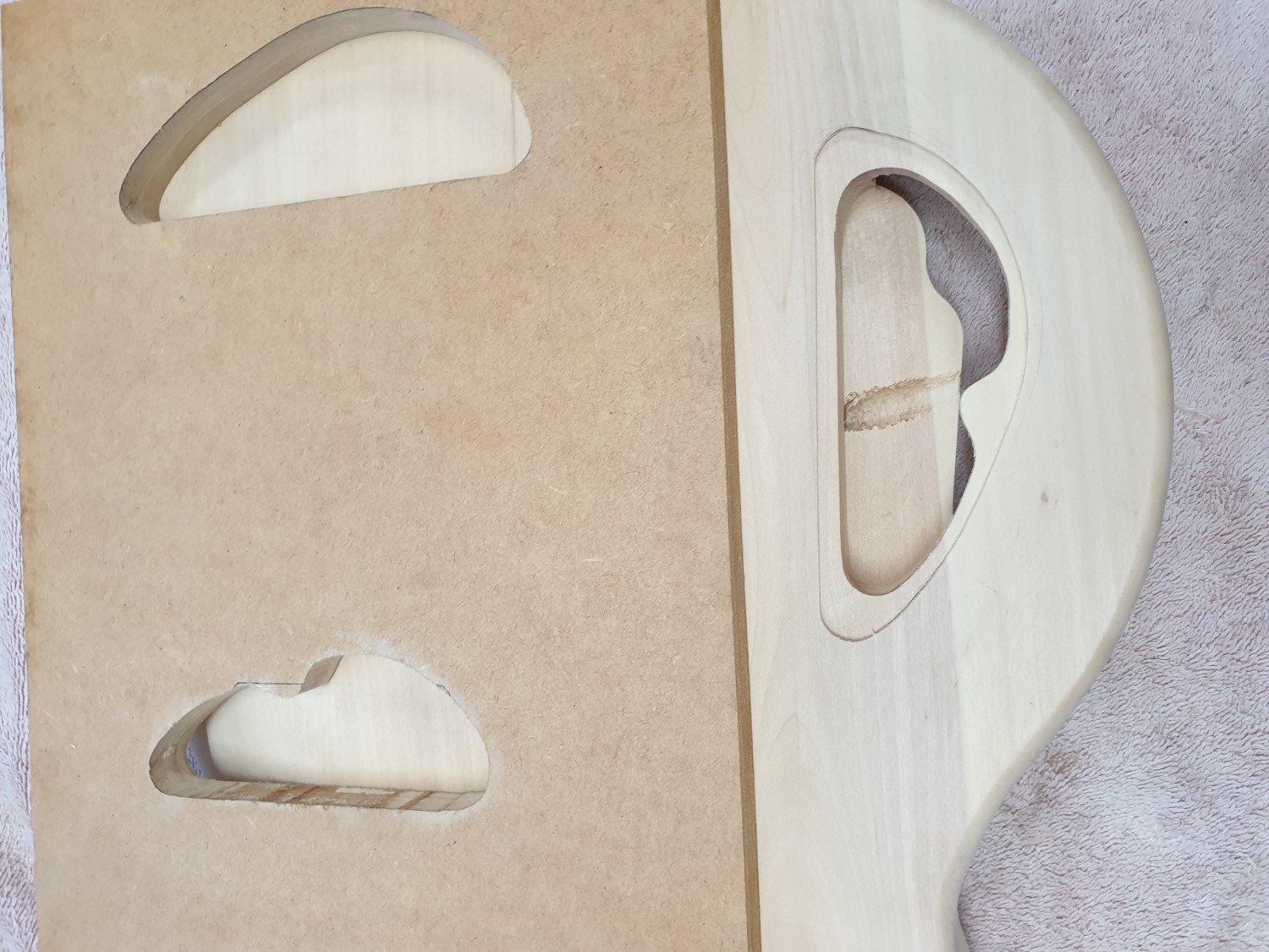 I decided to reshape the upper and lower horns this weekend. The upper was made slightly thinner and the bottom was shortened by about 20mm and reshaped. It allowed a better access to the upper frets. I also made the body contours more pronounced. In the future if the bass lives up to expectations I would fit an active EMG pickup or similar. I made a couple of quick templates and routed out a rear cavity so that there wouldn't be any problems fitting a battery and extra electronics. Attachment 36097Attachment 36098Attachment 36099