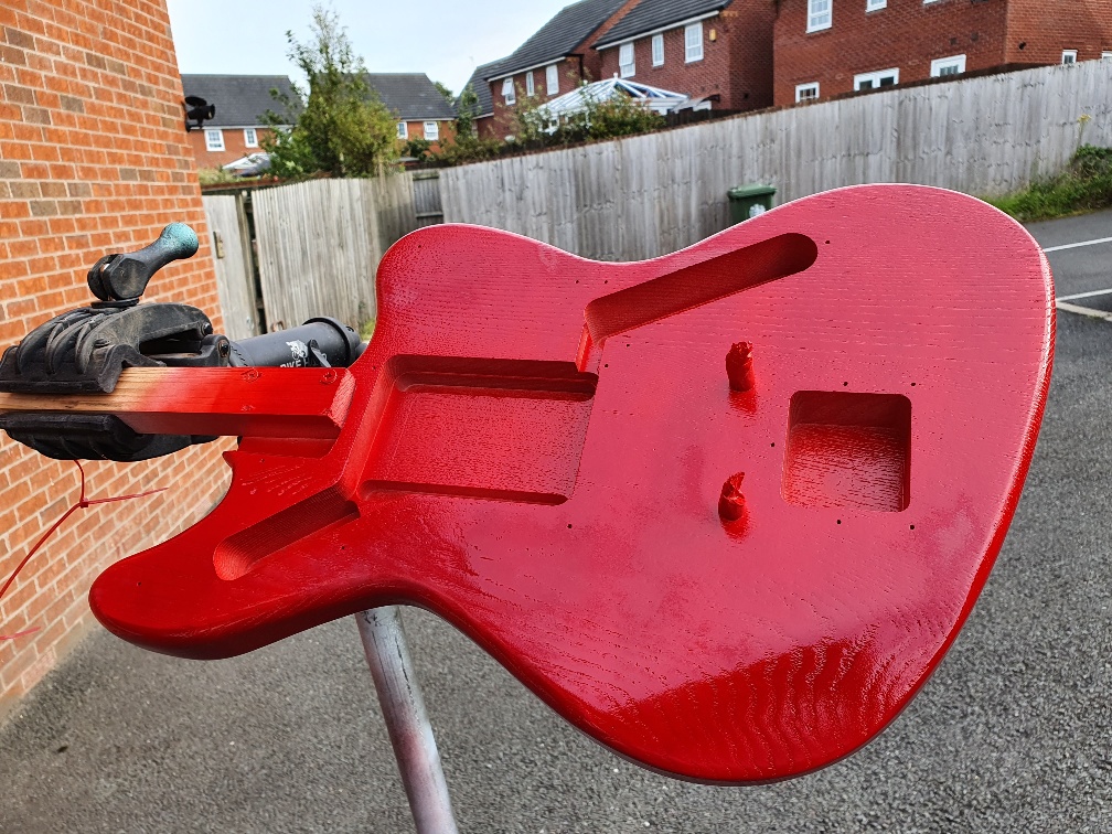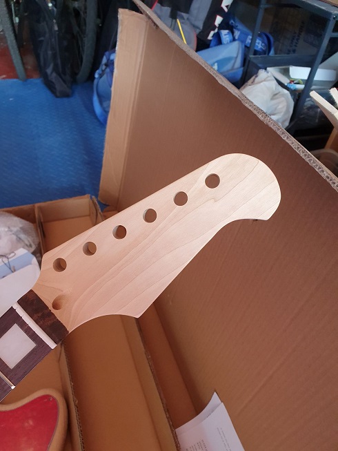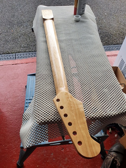 So far I have cut the headstock to shape, sanded the neck down to a final grade, and began oiling. I'm finishing with a Danish Oil as I like the feel of 'unfinished' wood, even though it is actually finished. For the headstock stape, I've gone for a slightly rounded Firebird / narrow Stratocaster hybrid shape.