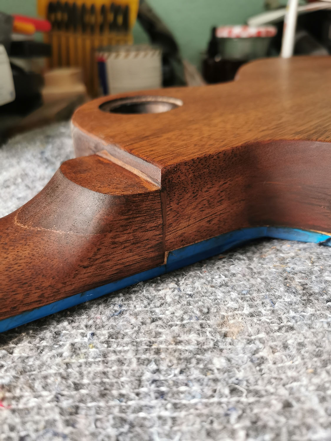 I stained this with Minwax oil based stain (which is very nice imho), but the spots where the body/neck heel has been glued together sticks out like a sore thumb even though I've been sanding these a dozen times. Also, there were a few scratches that I filled, as well as the rough cut neck pocket. The filler does take stain but it turns very bright red and also doesn't match at all.