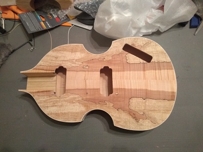 The first instrument I learned was the viola, so I've always been drawn to the violin style basses. I went with the spalted maple top for a more unique look. The plan is to go with a clear coat for the front, and black for the sides, back, and neck, but possibly use the same clear coat on the front of the headstock as the body.