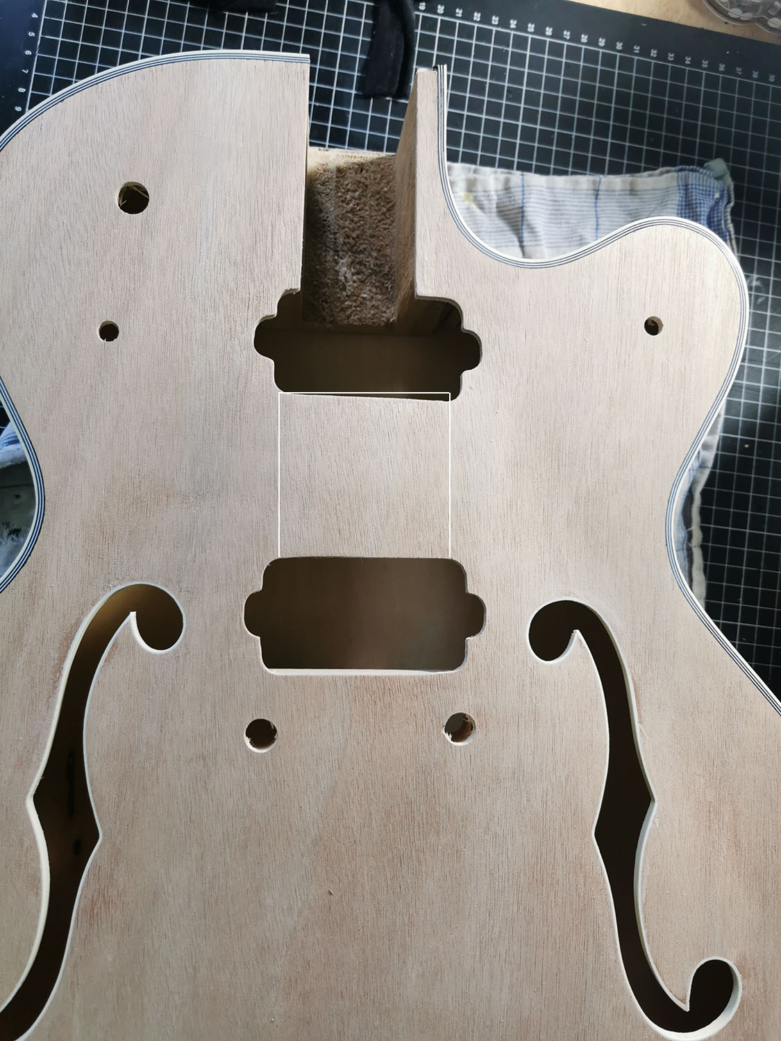 The kit itself looks really nice, had a few tiny dings that I steamed out with a moist cloth and a soldering iron. A few tiny spots needed filling, but most were around the neck pocket and get covered anyway. No glue stains so far. I *think* one of the pickup routes is slightly off, but I think it won't be too obvious when finished. At least this is what I hope :D