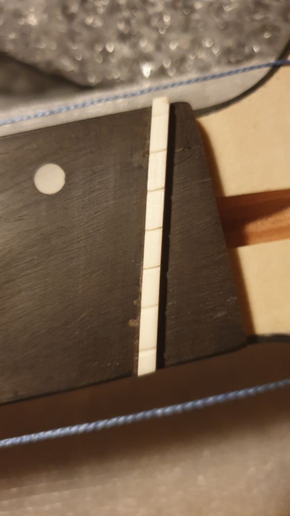 The nut is an awkward one as you won’t get a drop-in replacement because of the angle. You’d have to get a blank and cut your own nut slots. Which requires having a set of expensive nut files. I wouldn’t leave a nut with square edges at the ends, I’d round them off, which would take care of some of the damage. On a Gibson-style nut I’d also do a full round-off the rear of the nut, but I’d only do a very gentle rounding of the back of the nut on a Fender-style slitted nut like this. If the nut is quite tall and if the nut slots can be cut a lot deeper, then you can also file down the top of the nut so that the nut is only just tall enough to cover the strings. But without nut files, you’d need to file down the bottom of the nut to lower the slots, which means you couldn’t also file the top and remove the damage. So you’d really need to be sent a replacement nut.