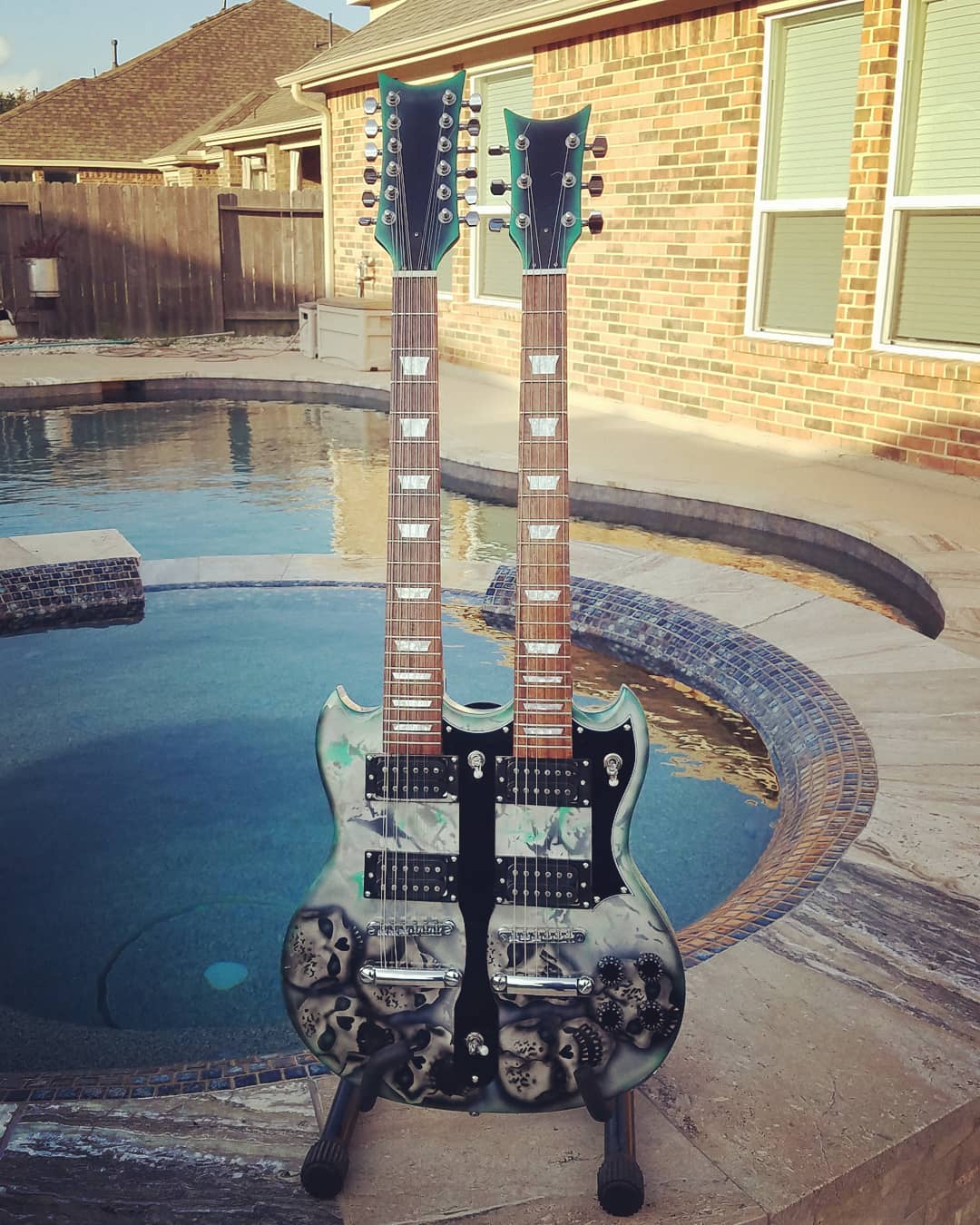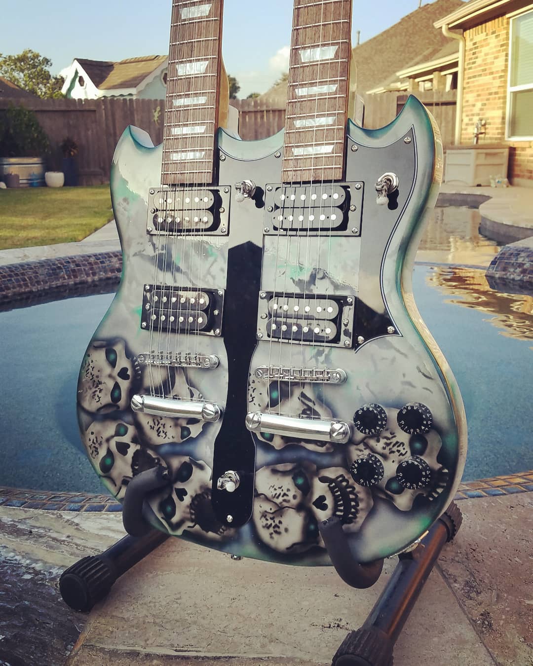 I've been playing guitar for going on 40 years. I just started building guitars a couple of years ago. I've always felt like a double neck was and electric guitar players rite of passage but could never convince myself to justifiably part with the funds. BUT!!! Now that I have taken so strongly to building guitars and Pitbull offering a kit a such a reasonable price, I couldn't pass up the opportunity to give it a go. This was also my first real attempt at airbrush art. Attachment 37752Attachment 37753