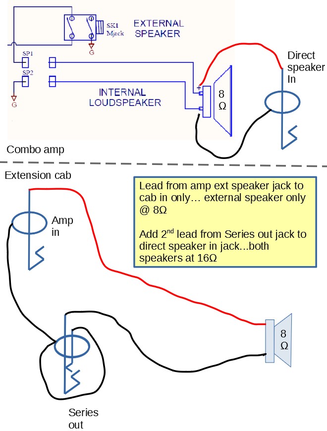 When you plug in an extension cab, the jack disconnects the internal speaker. I want to have the option to run the amp with both the internal speaker and the extension cab. I thought I could do it more or less they way the guy in this video did it: