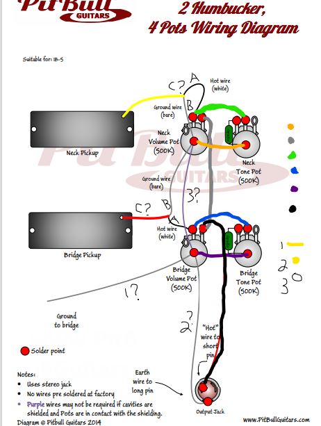 So I have begun to work on my wiring, at least the bits that are not coming from the pickups. I had followed the PitBull Wiring Guide which I have copied below, but I colored in the wires to match what I used in the actual photo below that. It should hopefully make it easier for my following questions.