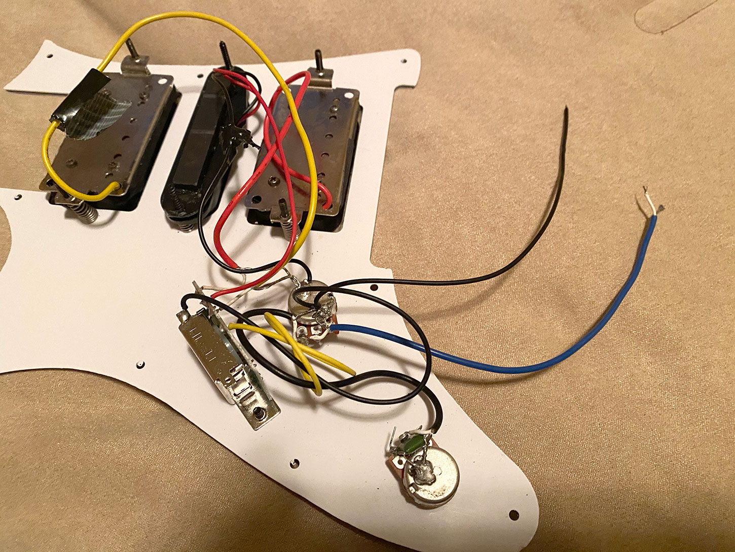I have attached a photo of mine, which looks a little different? There is also a video on the Pitbull website with this very guitar, but that too is different than mine. Looks like I only have 2 wires to worry about, but I can't find a real answer as to where they go?