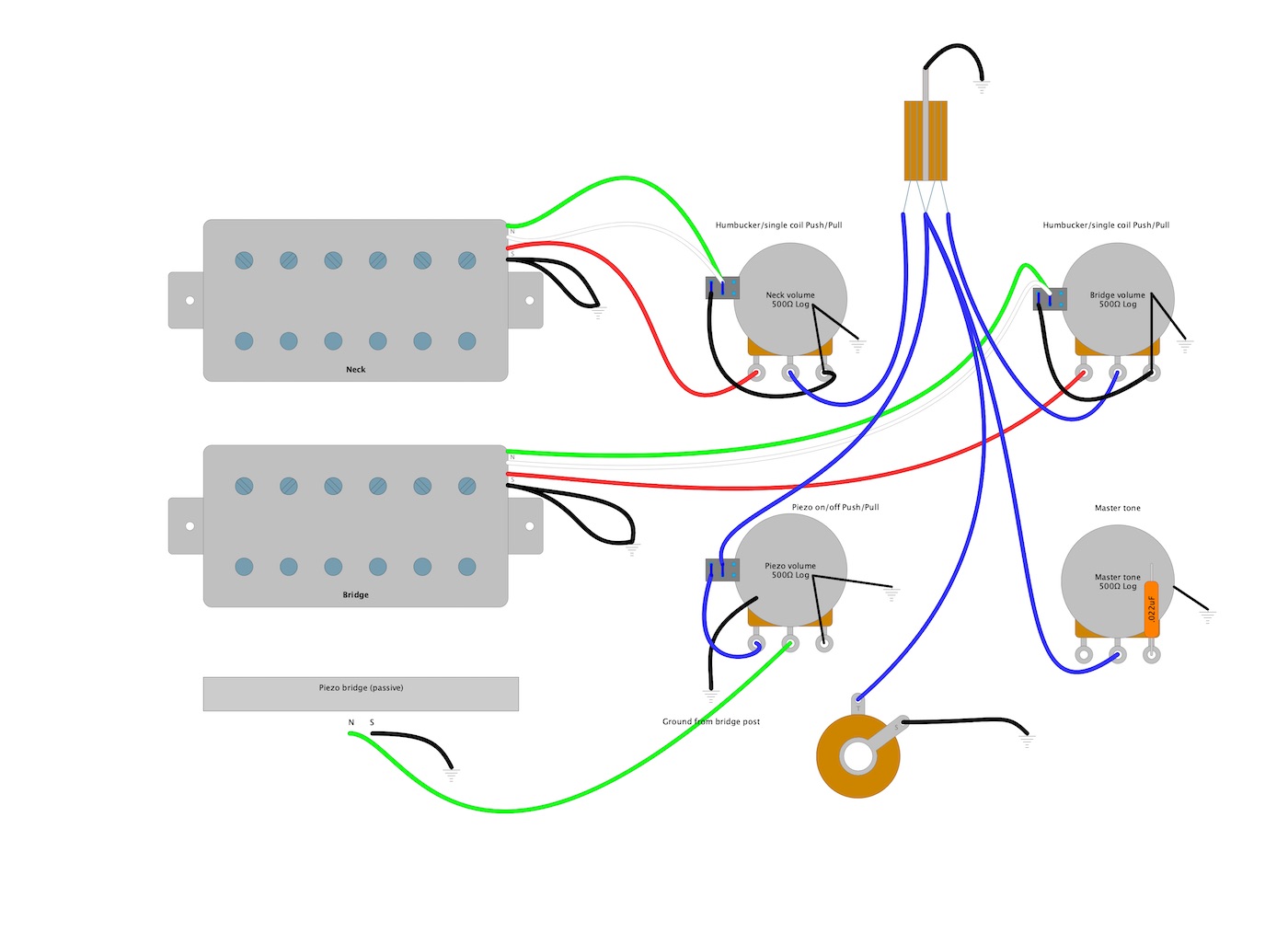 - The ability to run the piezo on its own. This does not work. The classic wiring on the humbuckers is also taking the piezo to zero when one of the humbucker volumes is taken to zero. I had thought that putting the piezo on the middle lug of the switch would solve that, but it doesn't seem to have worked that way.