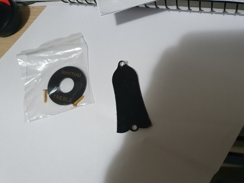 Truss rod cover and the round Rhythm & Treble 'poker chip' surround for the pickup selector switch. The two screws are for the truss rod cover, there should be some double sided tape on the back of the poker chip. Last things you'll want to fit.