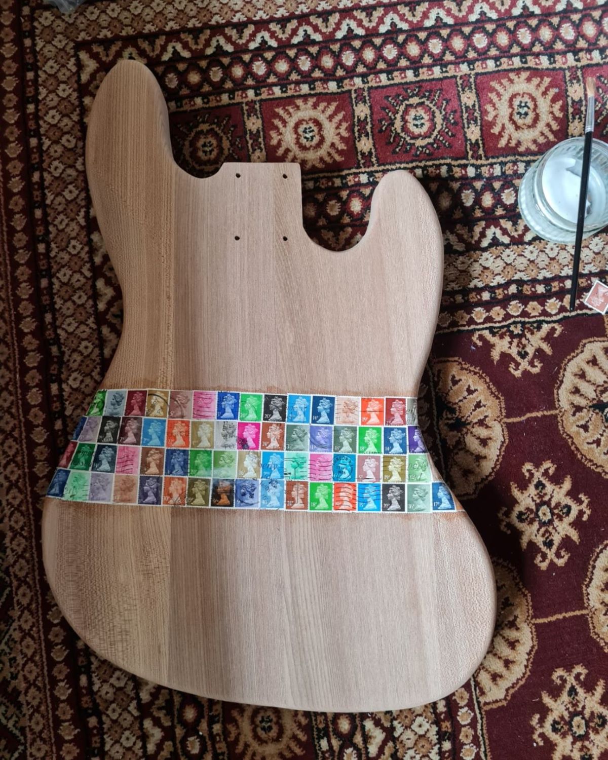 Over 700 stamps individually glued on with pva glue then a thin layer of epoxy resin over the top.