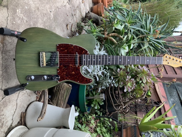 Just built my first kit. Upgraded to some nicer electronics and pick ups. Brass Fender bridge pieces on nickel plate. Self mixed green stain, Tru oil finish on body and coloured nitro on headstock. Neck sanded fine and oil lightly with no nitro for relived worn feel. Plays like my 75 Tele and sounds bright and full.