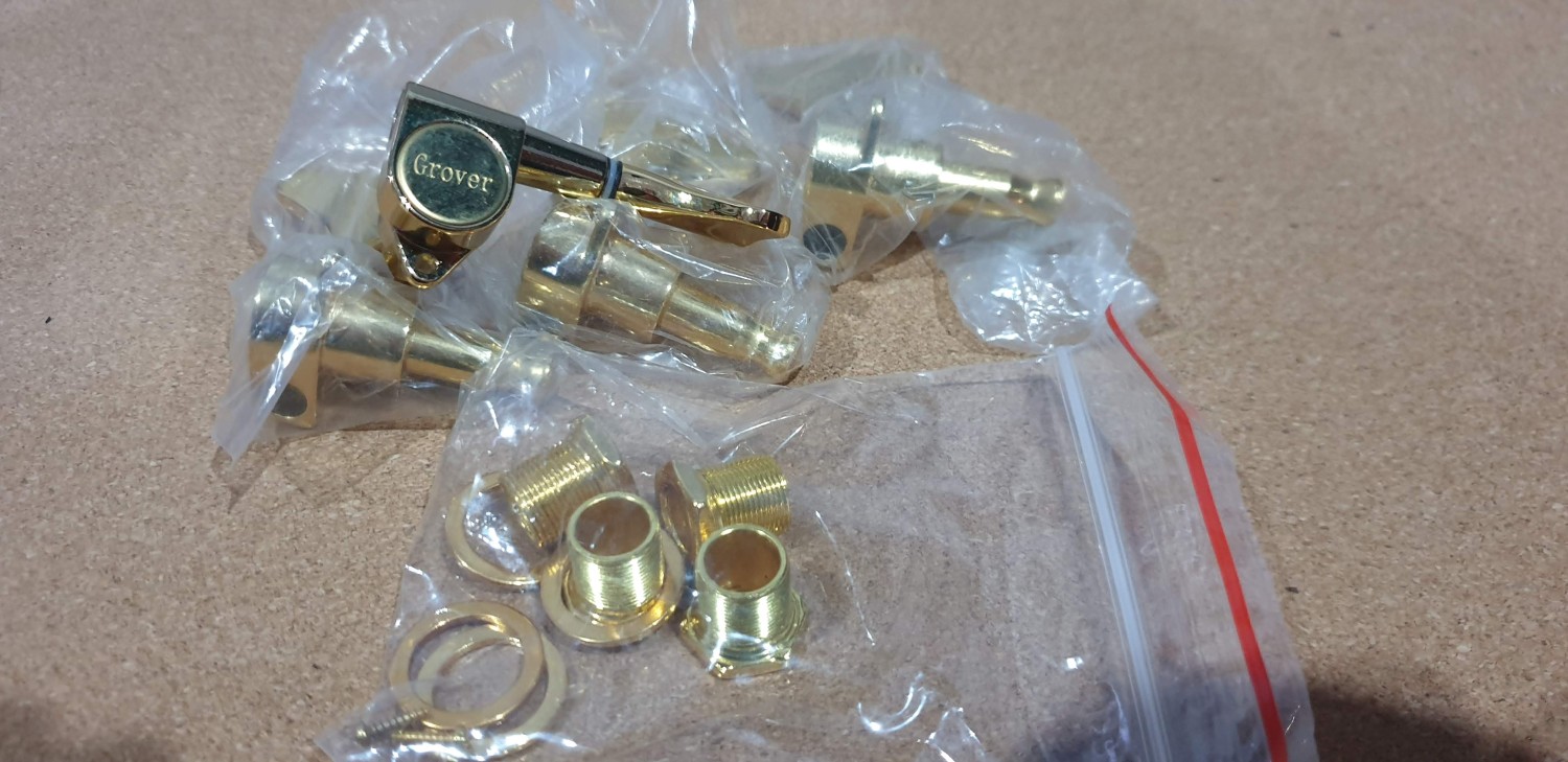 Grover 144 Series Mini 4 inline gold tuners. Never installed. Only ever pulled one out of the pack to take photos. Ordered with a PBG kit, but decided to take a different direction