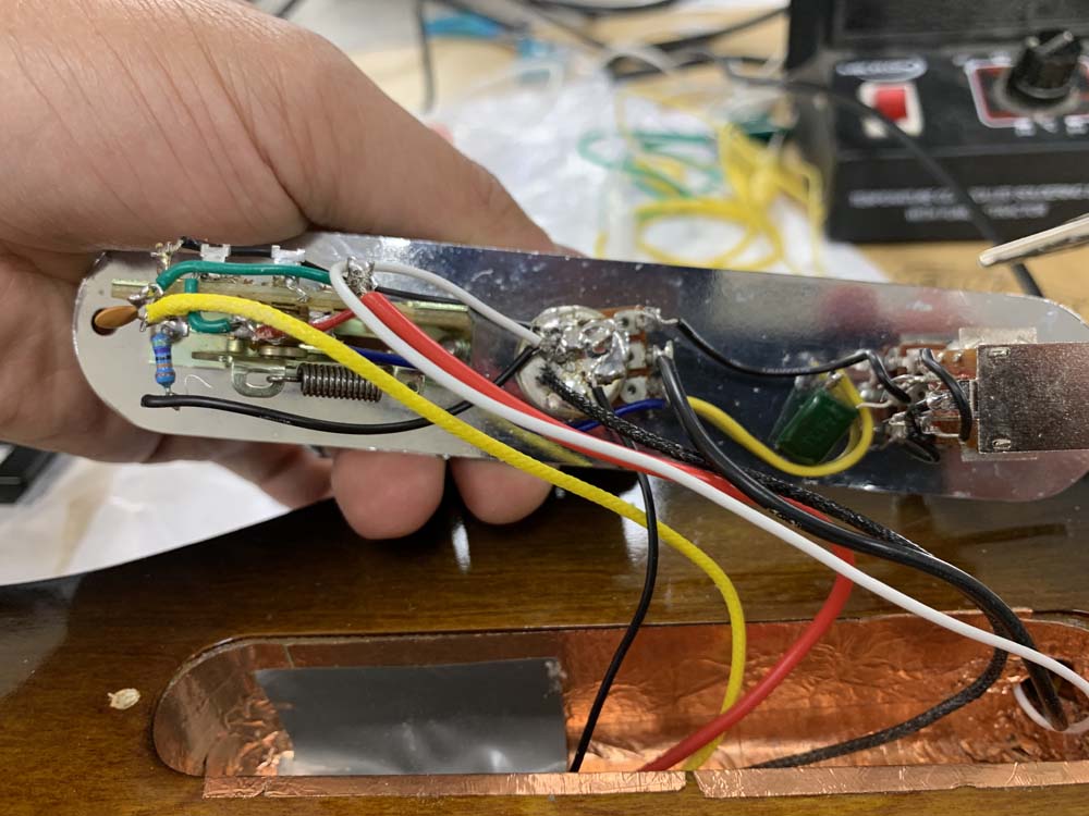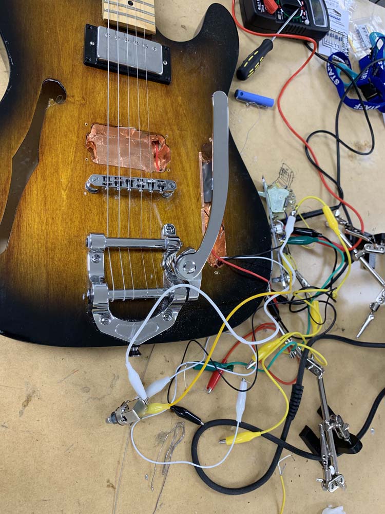 What I didn’t realise last time was that the 5 way switch possibly requires a deeper cavity otherwise the copper tape can get in contact with the switch and shorting everything out. I’ve placed some electrical tape where the contact may occur to stop this