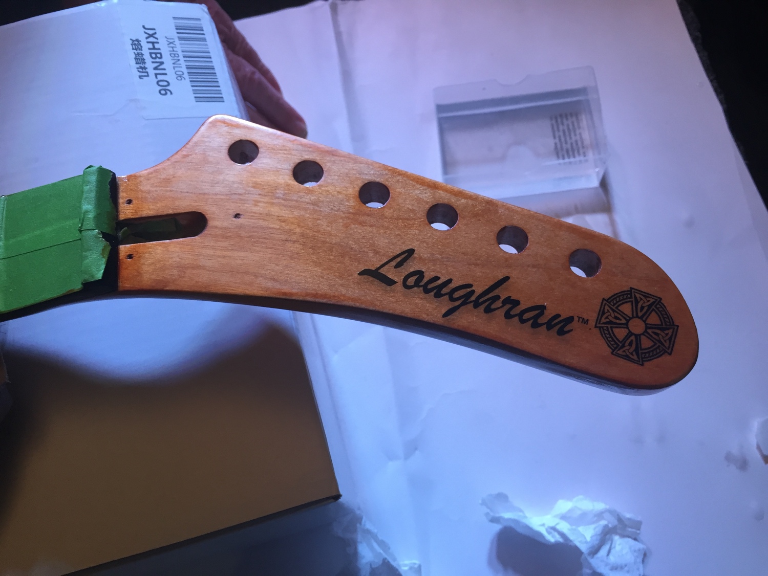 Neck wise, well it turns out that the tape I used has left residue on both the rosewood fretboard and the sides of the neck. On the fretboard I used a small amount of handsanitizer to good effect to remove the gum. Im not concerned as the fretboard will get a good Dunlop oil in due course..and the neck needs a little sanding anyway.