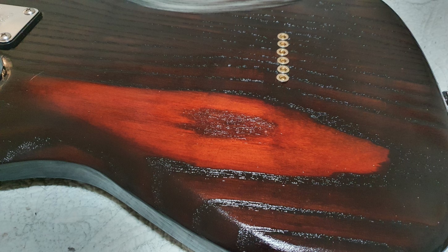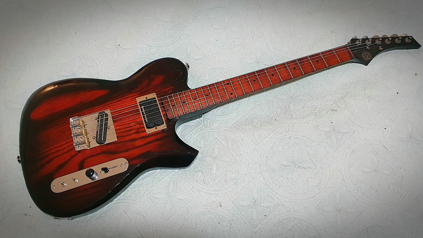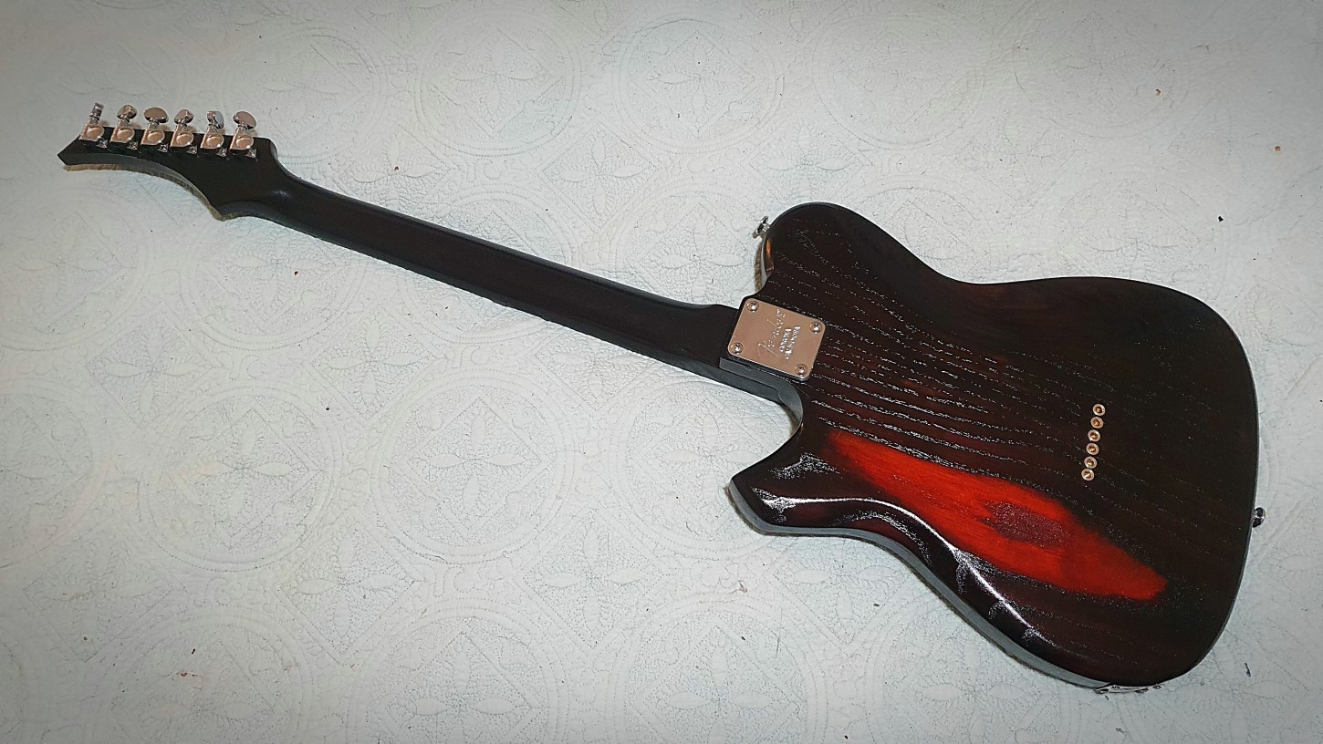 The figuring on the ash body was not done justice to until this time around. My first effort was with poor dye, the second was with a torch, it was ok but just didn't hit the right spot for me. I have heavily modified the body from the original. Lots of carving, humbucker rout for the neck and a new lower horn. The control plate has been recessed into the body. The stain is from Crimson and I used Dulux Duramax for top coat. Sanded with 600 grit after 1 can. It is not polished as I wanted the texture of the grain to be a feature.