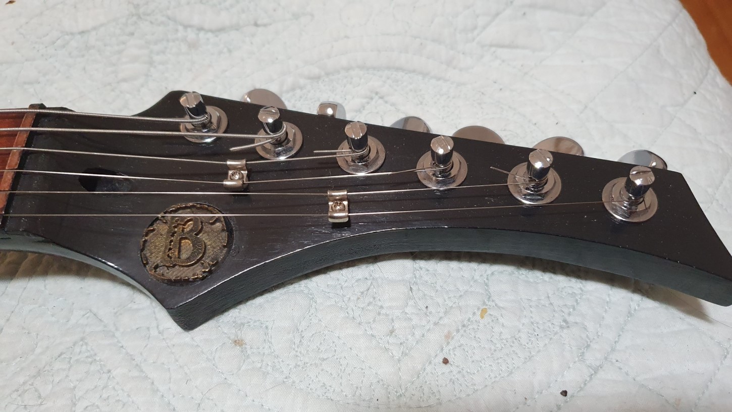 Noice. Can see this thing making some noise! Great looking guitar with some sweet looks. Use of the D’Addario tuners is a great idea. Minor point – next time feel free to experiment with your own logo!