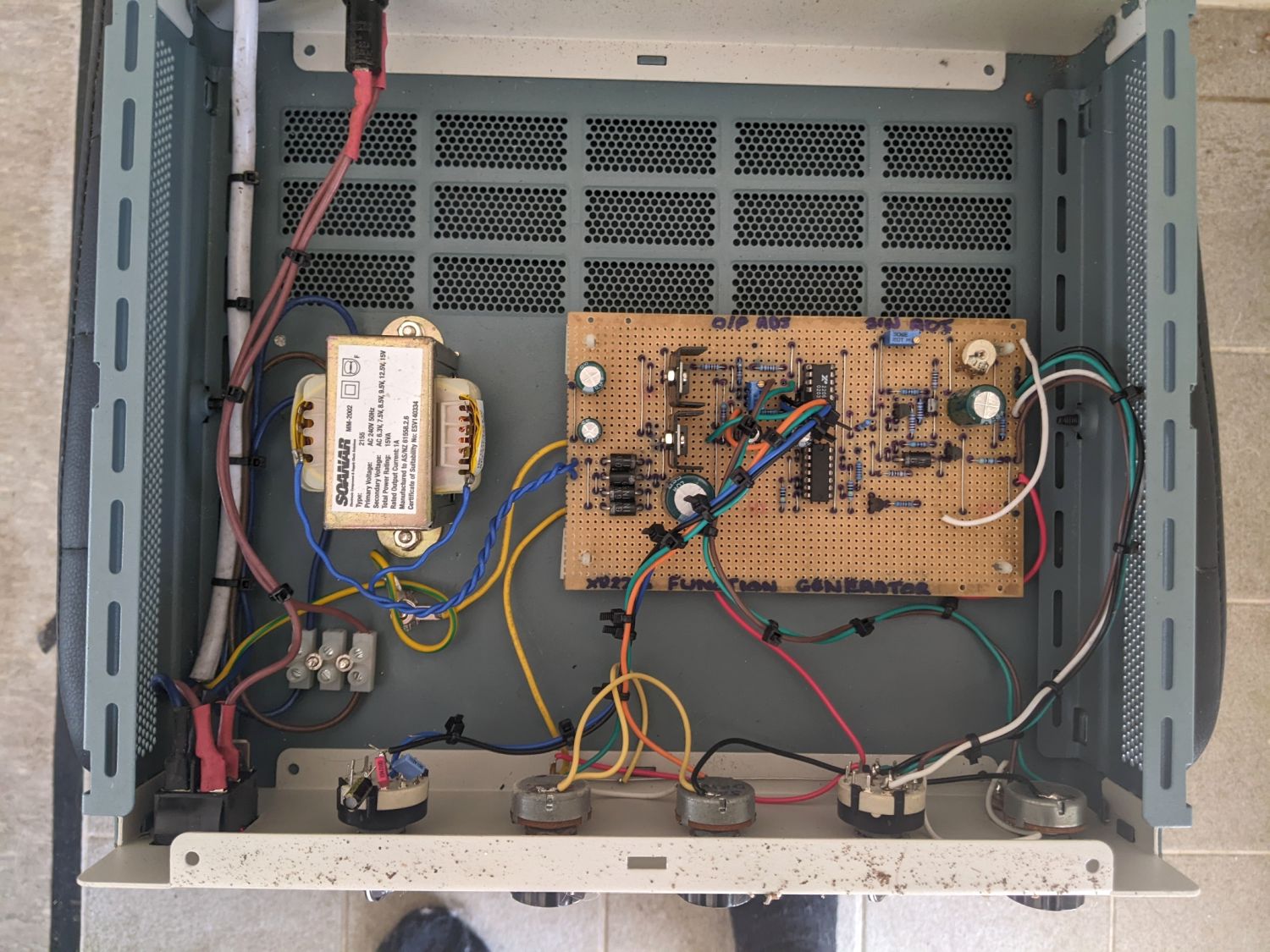 As you can see, there's not a whole lot inside the case, of course I could have used a smaller case to house all the internals, but I like the "aesthetics" of the case I chose, it has a Laboratory test-equipment look to it, my DIY Function Generator uses a mains power transformer to power it, but since I'm going to have to re-create the circuit board layout from scratch anyway, due to my old studio computer breaking-down last year and the original layout was amongst all the files I lost as a consequence, I'm going to re-design the circuit board layout from scratch so you can safely power it using a standard DC plugpack adaptor, I do need to make a minor mod to the original circuit so that you can control the output level of all three signal waveforms though, the Sine and Triangle waveforms are variable in level, but the Square wave level is a bit too high for practical use, I will include the mod in the re-designed circuit board layout once I know the mod works perfectly.