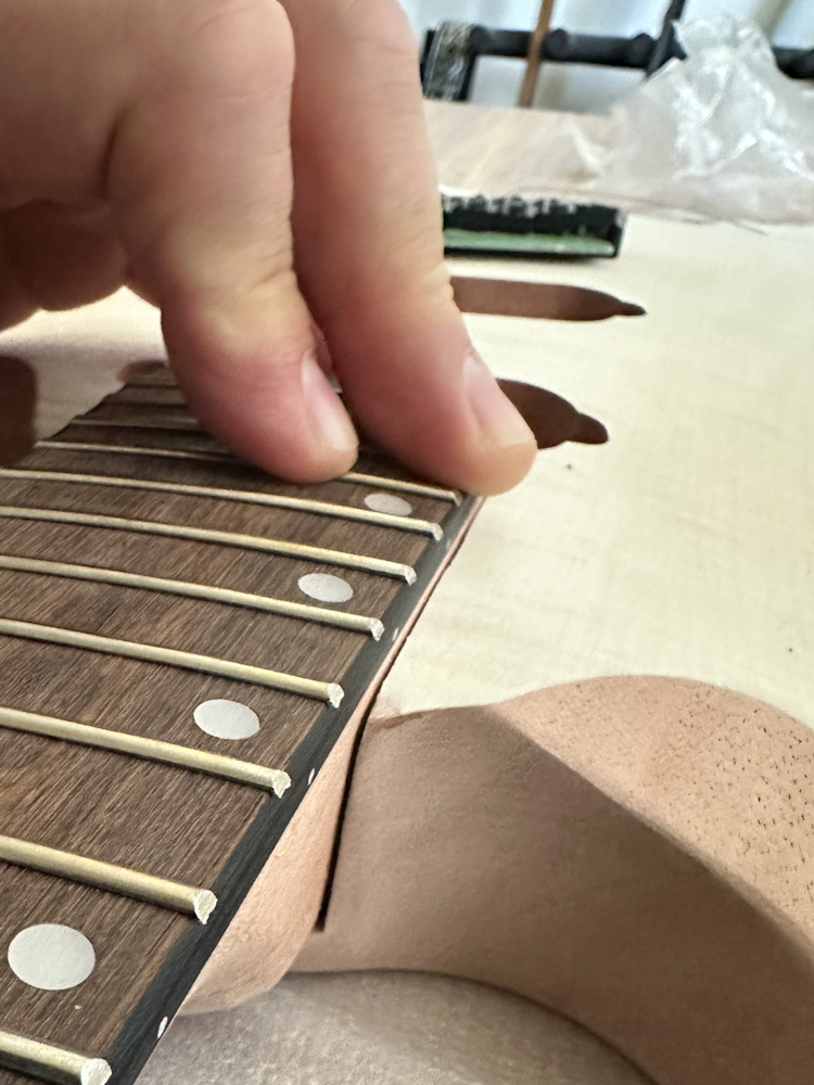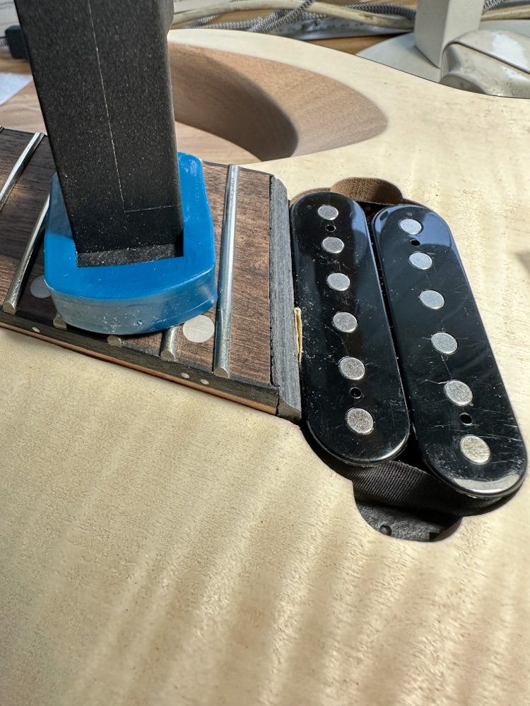 • again the neck heel appears to sit high in the pocket-so as to loose the clearance underneath the neck PUP. But as above I can't really test this yet. I don't know if any material can be safely removed from the bottom of a neck heel without affecting alignment in other ways.
