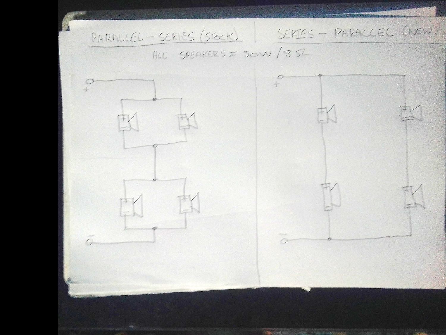 Here's why we end-up with a total impedance of 8 Ohms for each of the two wiring methods, in the case of the stock Parallel-Series method of wiring, if we wire two 8 Ohm speakers in parallel we get a total of 4 Ohms, if we wire 4 Ohms in series with another 4 Ohms we get a total of 8 Ohms because the two 4 Ohm speaker loads add-together.