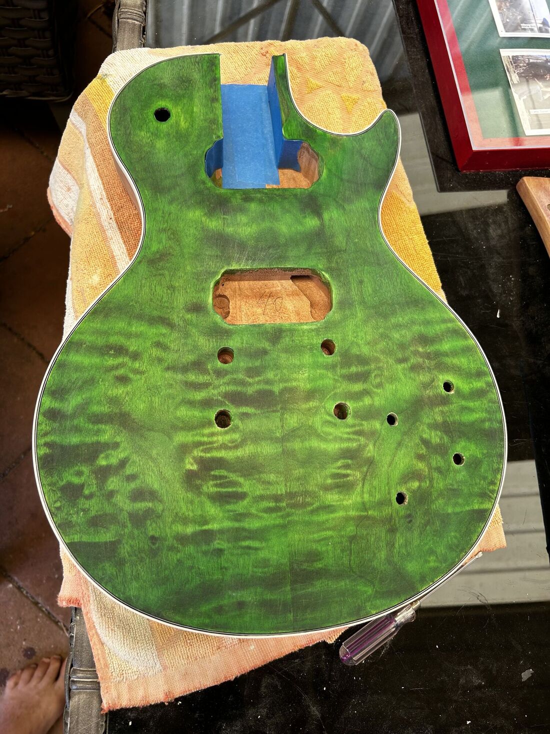To highlight the Quilt I applied a mahogany grain filler on the veneer and then rubbed it backl. I procrastinated over what colour it would be to show up the Quilting. Then I remembered in the past that a fellow member posted that he used "Food Colouring" as a coat option. So I checked around and settled on green and bought "Queen Classic Green". Simple to apply and an amazing result.