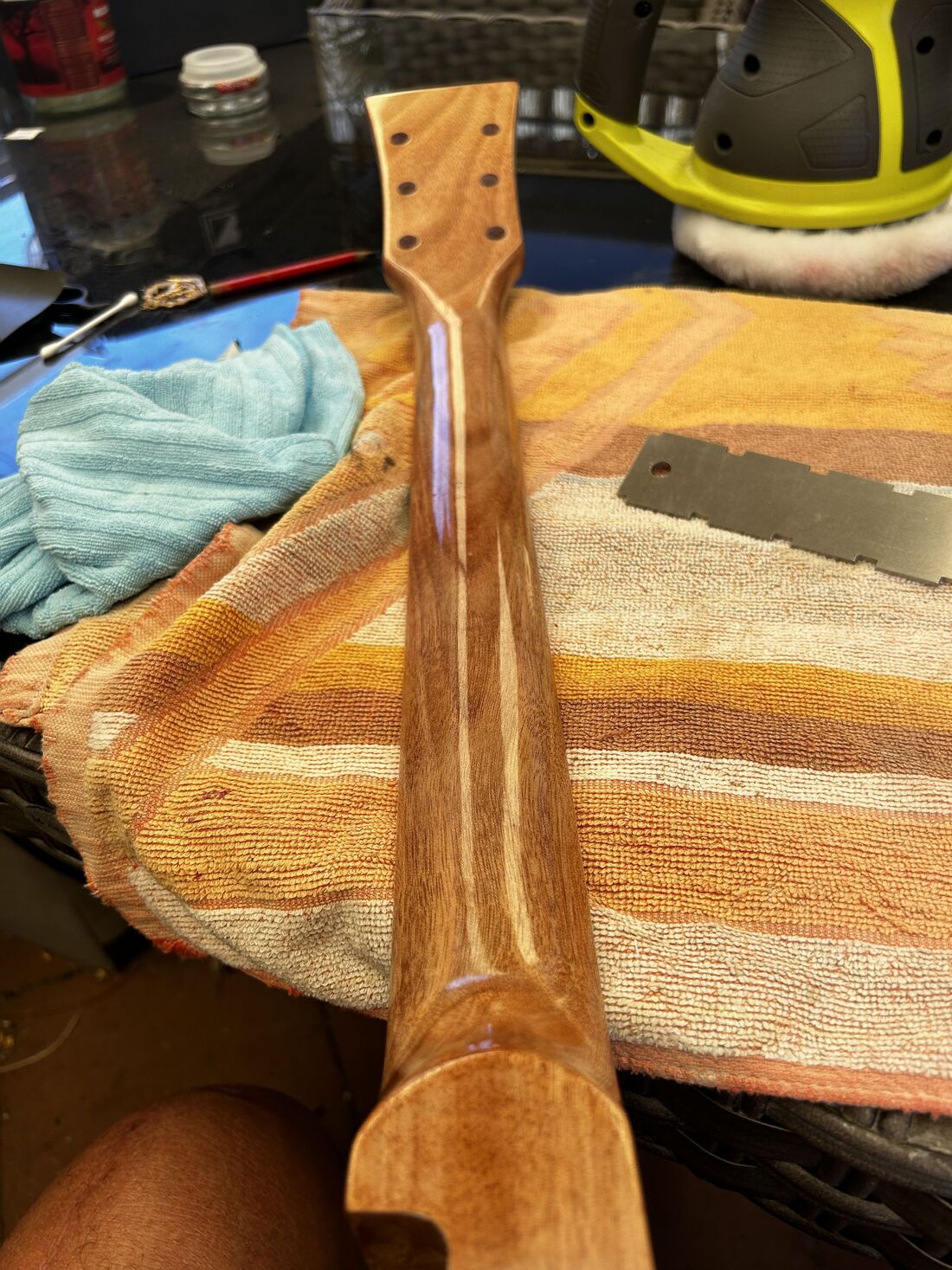 I left the back and neck natural Mahogany with just grain filler and a clear coat. As I posted in a recent thread a bought some COLORSPEC Acrylic Paint, Deep Crystal Clear from SuperCheap. It is Isocynate free but it features unique 2 pack properties in a pressure pack (Reading off the label). The beauty of it was that it was easy to spray and I could put on coats every hour. This is during summer so I don't know about cold weather. I then used a small electric polisher with SCA Cut & Polish and acheived a very high polish.