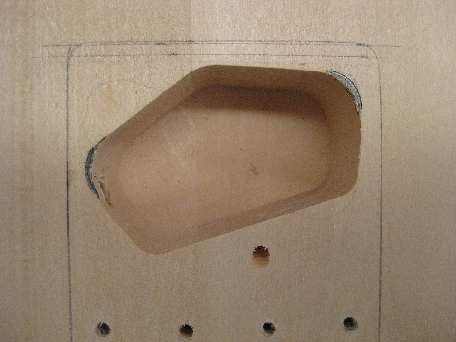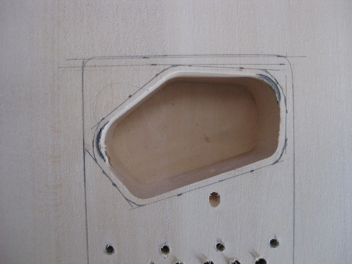 Then around the cavity with the dremel and now there is enough space for some copper tape to line the cavity and the pickup to sit comfortably in the space.