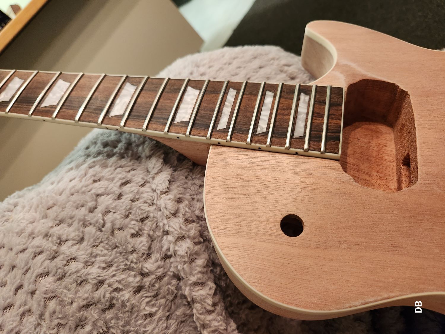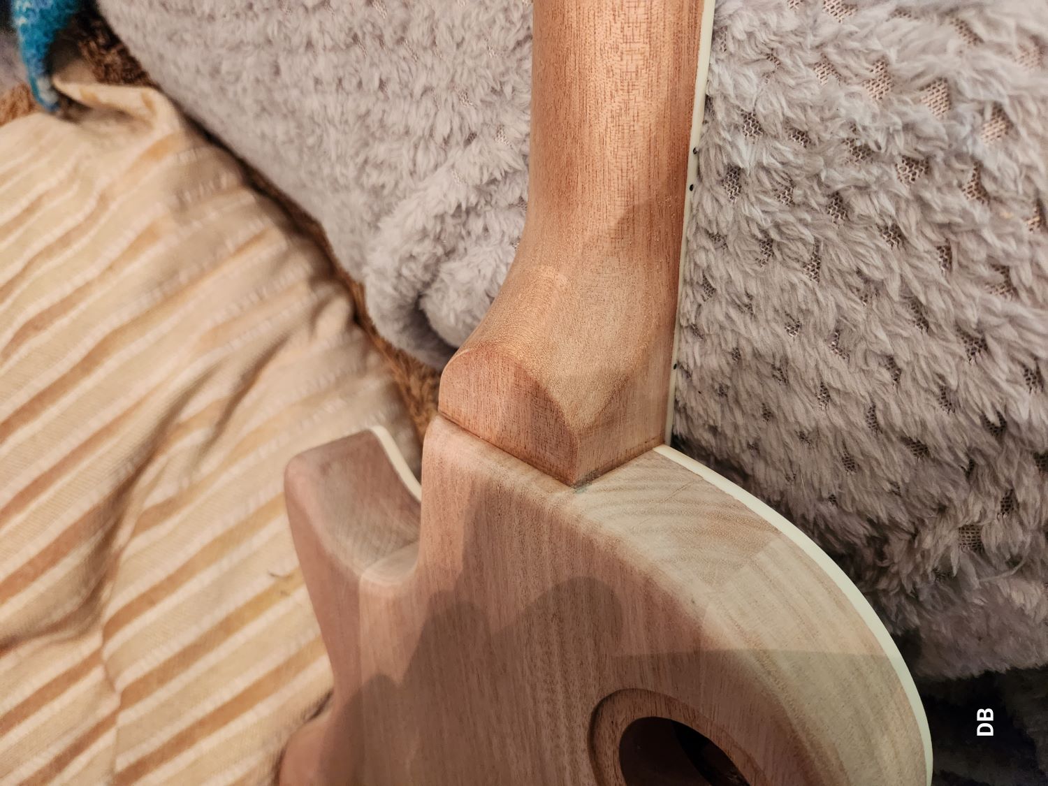 Gidday everyone this is my diary of the Les Paul build so far, here are some fotos of the neck join i fettled the wood to get the best tolerances i could between the body cavity and neck i wanted it streamlined and smooth with no gaps or noticeable protrusions in that area.
