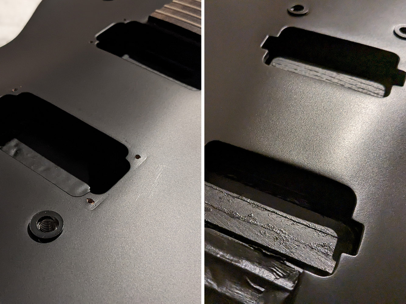 No new build is planned atm, so I took some time to do this project. And this was not that easy, for the cavities were horribly drilled and looked ugly inside. With huge space, that makes the humbuckers look lost and crummy. But I think it is normal for that price category. You can see the comparison before and after.