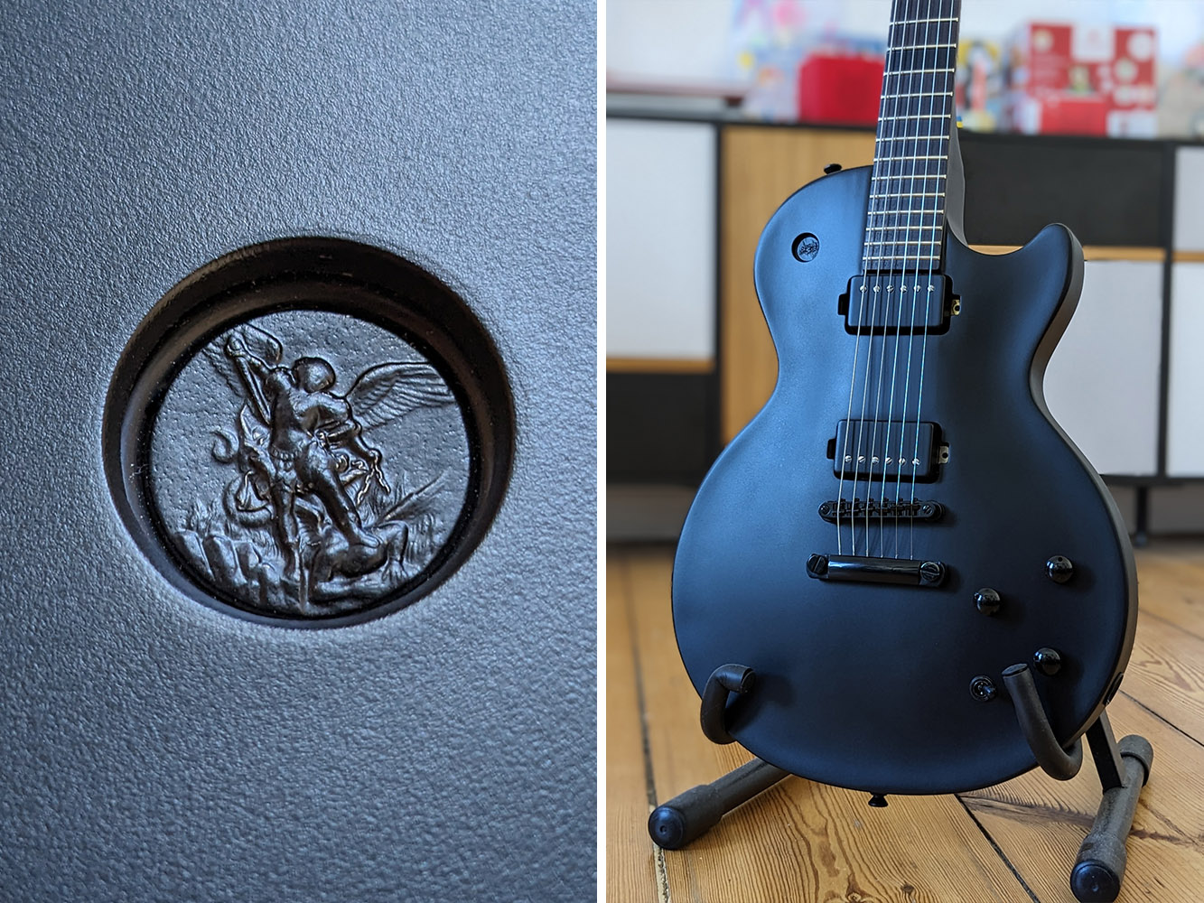 And during the work I had an idea for the former switch space. Placing an unique element, to make the guitar more individual and adding some special detail. After searching for some cool coins, I found this medaillon of archangel Michael that fits the look of the guitar quiet fine, having some sort of relief. And the meaning of battle between dark and light forces seems to fit quiet fine in my eyes to the original gothic/metal theme...