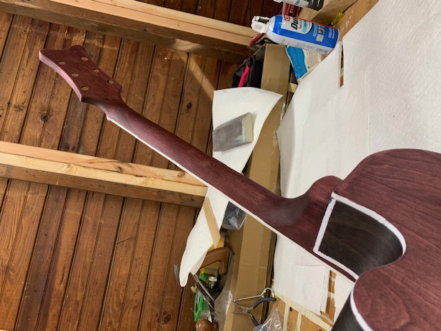 Only little blemish I found in the first look and dry fit was a little yellow splotch at the bottom. I tried to sand it out the best I could but figured a dark stain plus the Bigsby would do enough to cover it.