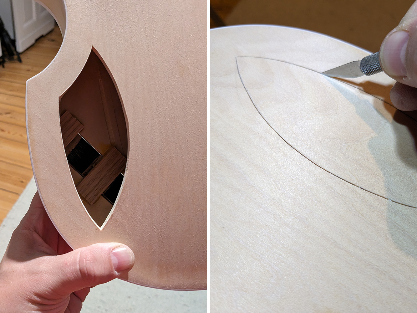 I want to close the cavity and veneer the Bass with some burl...I simulated how it should become if I color it with shades of black, keeping the burl slightly visible...overall the look of black and chrome and maybe a bit of white from binding...But making it white could also be an option, then I will use some smoother and calmer veneer I think...