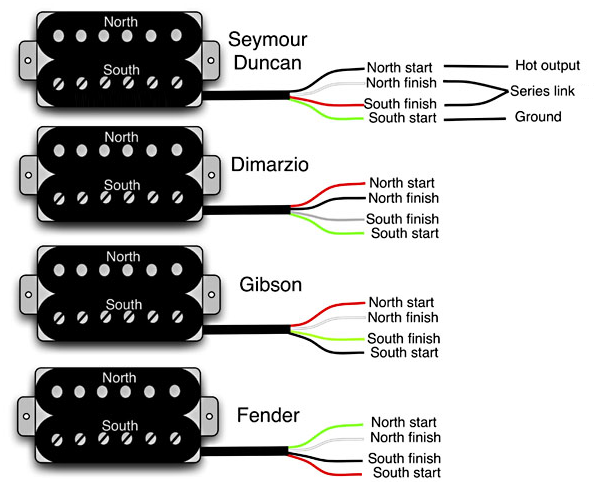 The problem is associated with the 4-wire Humbuckers sometimes being used instead of the 2-wire variety. The other issue is that there is not a "standard" for the colours of the wires from the manufacturers.