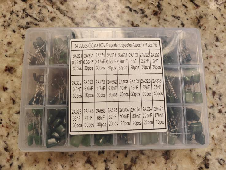I have learned that nothing quite beats experimentation. To do that you need caps and resistors of different values. As a died in the wool cheapskate I was happy to learn that 660 capacitors in 24 values can be purchased as cheaply as just a few "guitar" caps. For less than $7 US, I got these 100volt polyester film caps (chicklet caps). These are the same caps Leo Fender used in G&Ls.