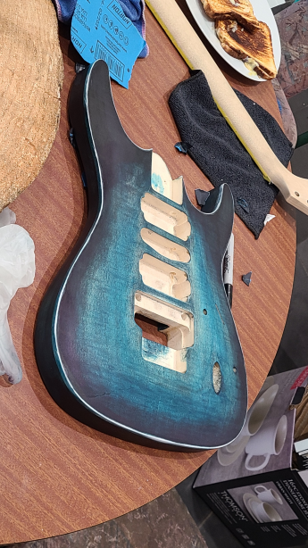 Following that it was staining, originally I wanted red but decided I have too many red guitars (some seen in the pics) and wanted something different so blue with a dark edge it was.