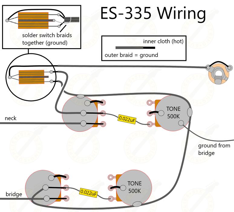 Given the placement of the switch, far away from the pots and jack, I'm guessing the b/w wire would go from switch to neck/bridge volume pots? The 4" pieces go between the 4 pots and the remaining wire is used for switch to jack and ground to bridge and ground to jack? And what about the braided push back wire - do I need that?