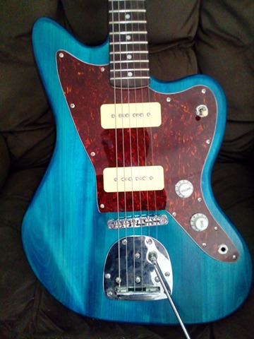 I ordered this as a special order with the Bigsby. Added a roller bridge, Jazz master style pick ups, mini Grover tuners and a custom cut pick guard with my art work on it.